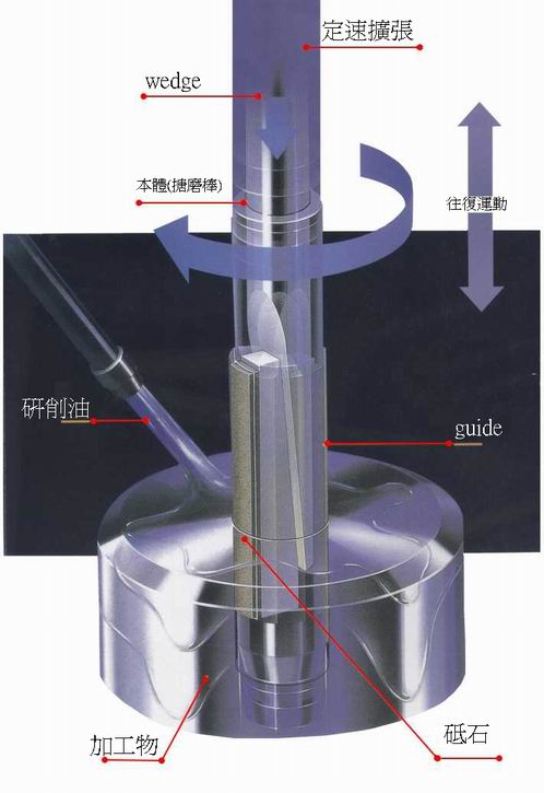 在NISSIN是採用依據也是搪磨機心臟部的砥石擴張方式『螺牙或楔子式』的自動機械擴張方式。對加工的行程實施同期而且正確的微小進刀(定速擴張)使對表面粗度提昇的量產加工和高度加工群的形狀精度修正、完工公差很小的超精密加工變成可能。